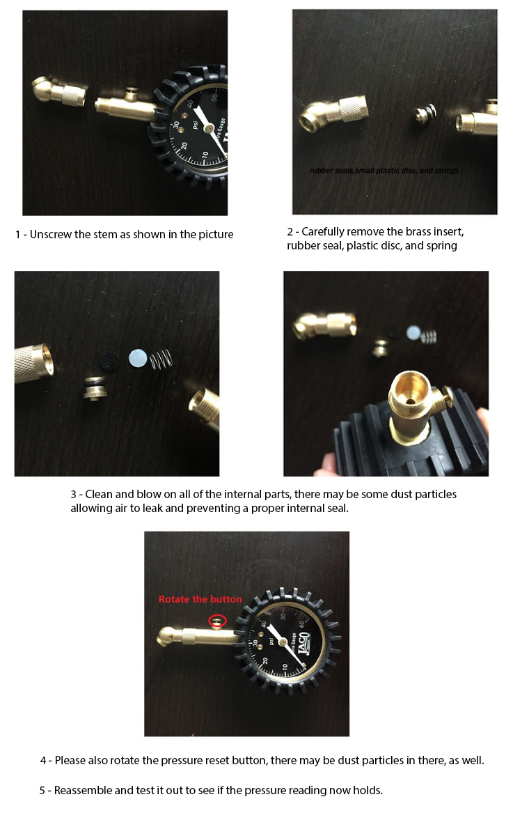 Step 3 - Gently clean these three components by blowing on them to remove any small dust particles and/or lightly wiping with a clean cloth and a small amount of WD40 or similar cleaner/lube. The key is to remove any tiny dust particles that may be blocking the seal to prevent the pressure reading from holding.